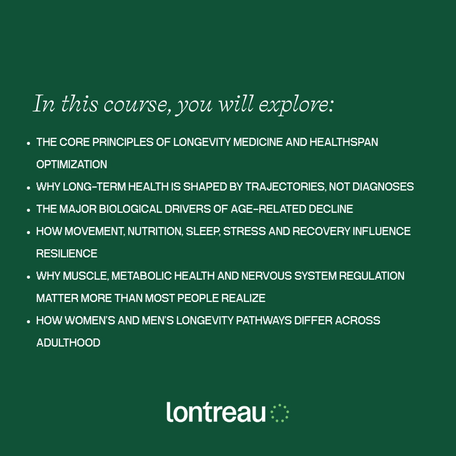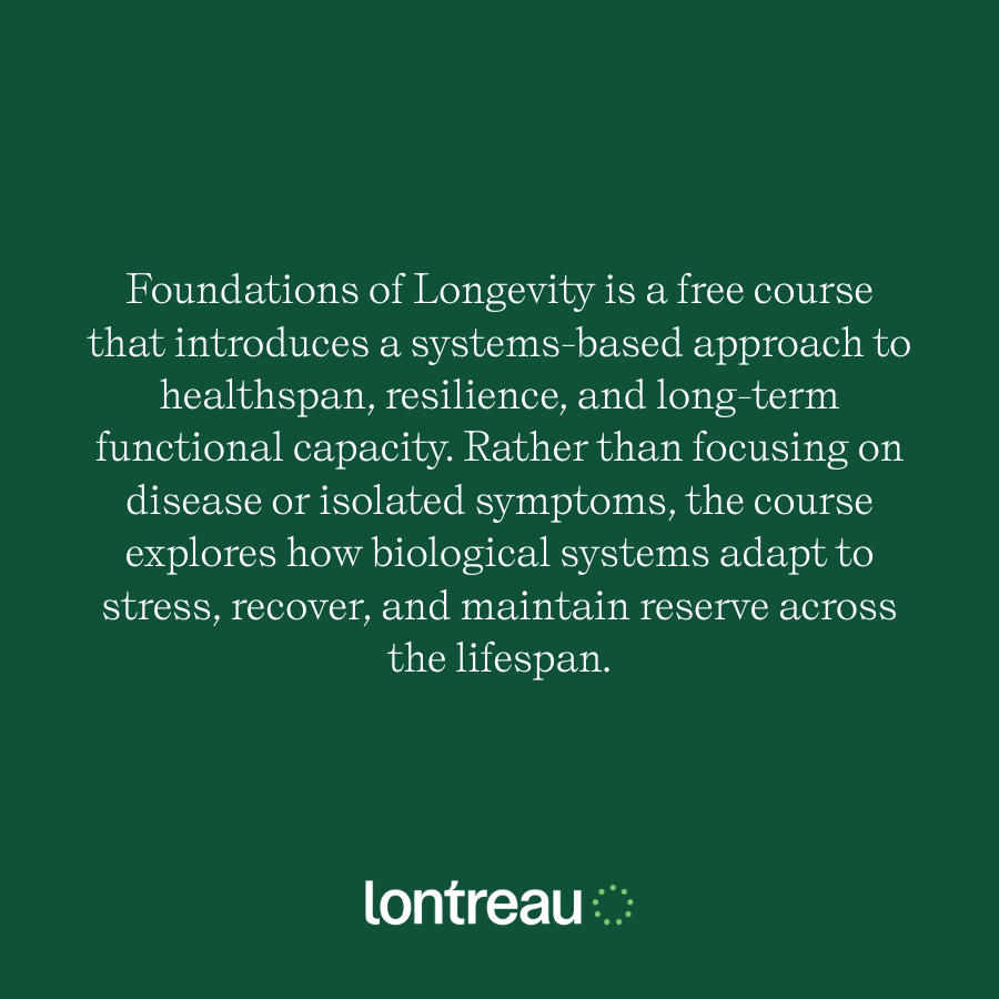 Foundations of Longevity is a free course that introduces a systems-based approach to healthspan, resilience, and long-term functional capacity. Rather than focusing on disease or isolated symptoms, the course explores how biological systems adapt to stress, recover, and maintain reserve across the lifespan.In this course, you will explore: